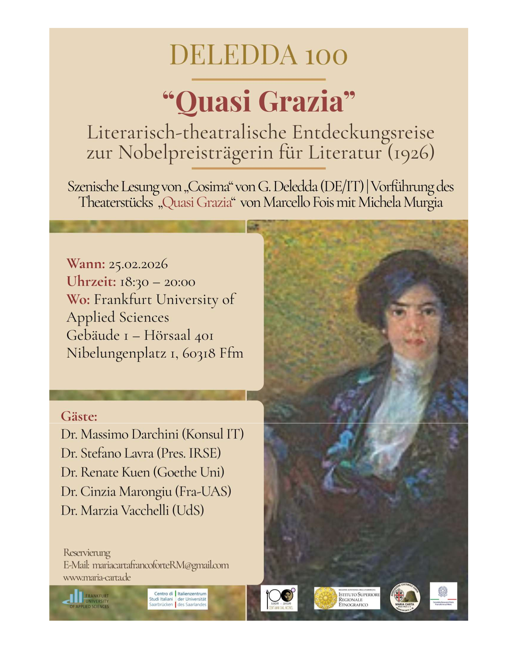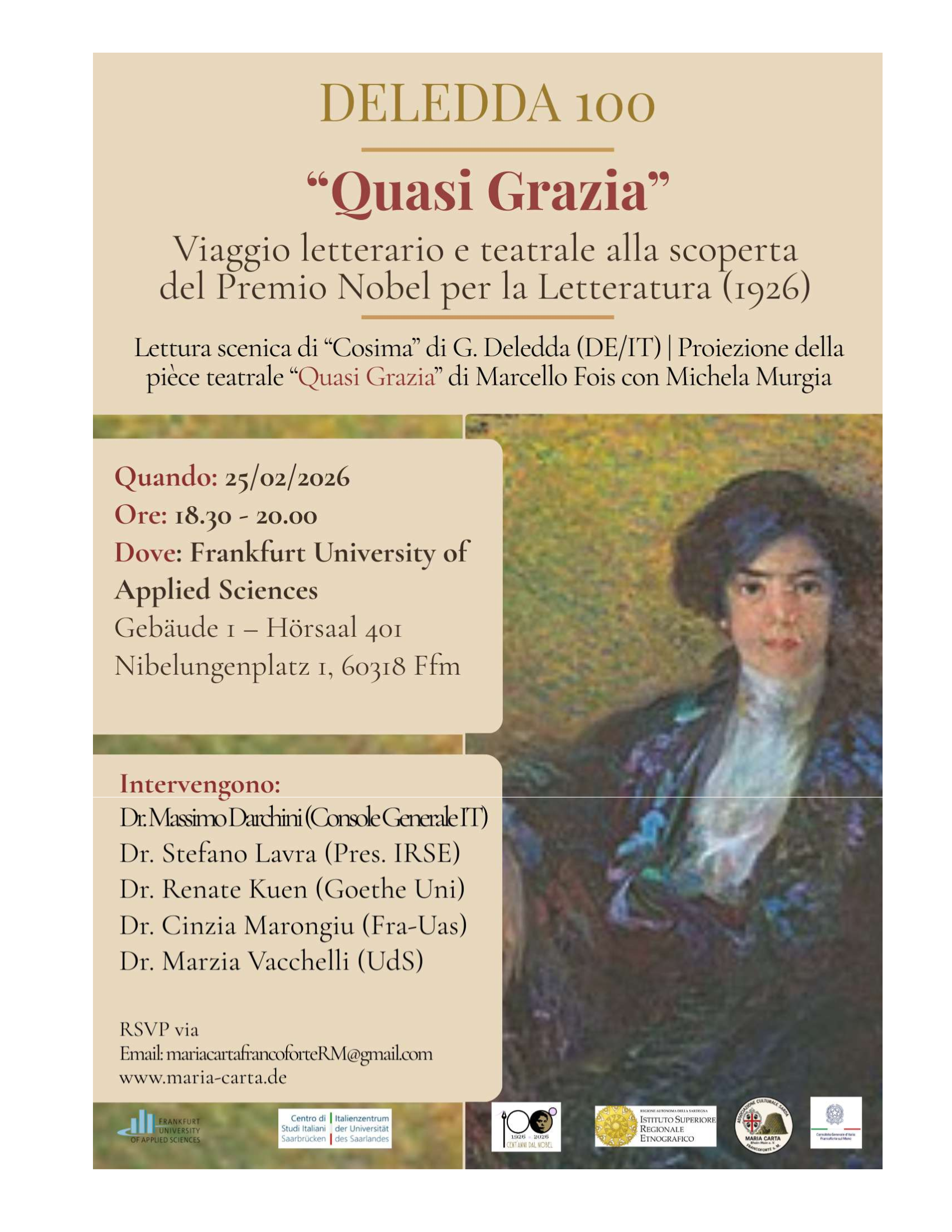 Der Sardische Kulturverein Maria Carta Rhein-Main Frankfurt e.V., offiziell von der Autonomen Region Sardinien anerkannt, eröffnet in Frankfurt am Main die Veranstaltungsreihe DELEDDA 100, ein Zyklus von Events zum hundertjährigen Jubiläum der Verleihung des Nobelpreises für Literatur an Grazia Deledda (1926–2026).